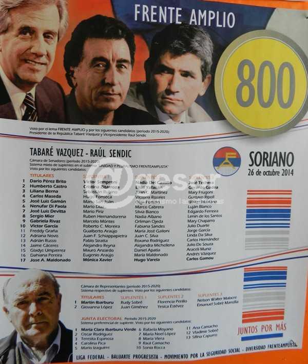 El Frente Amplio en Soriano presenta doce opciones electorales a través de las listas 642, 800, 1001, 1642, 1968, 2121, 3311, 5271, 6009, 90609, 711764 y 775005, encabezadas por la fórmula Tabaré Vázquez - Danilo Astori y los doce candidatos a diputado son Damián Alonso, Martín Ibarburu, Antonio Benítez, Florencia Caldes, Pablo Cabrera, Julio Guastavino, Betina Piñeyro, Juan Sardella, Walter Maidana, Enzo Malán, Ramón Mastandrea y Gianina Prado. Adjuntas ofrecemos las dos hojas de votación.