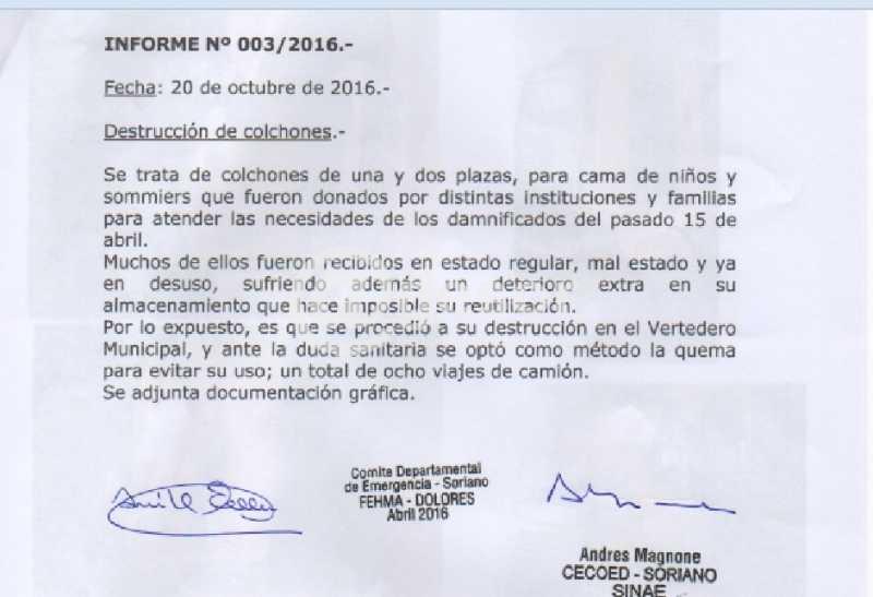 Oportunamente el CECOED seleccionó en el entorno de 400 colchones entre los que se tienen acopiados. Al no cumplir los seleccionados con las mínimas condiciones para ser entregados a los damnificados, ya que podía existir riesgo sanitario es que se procedió a su destrucción.