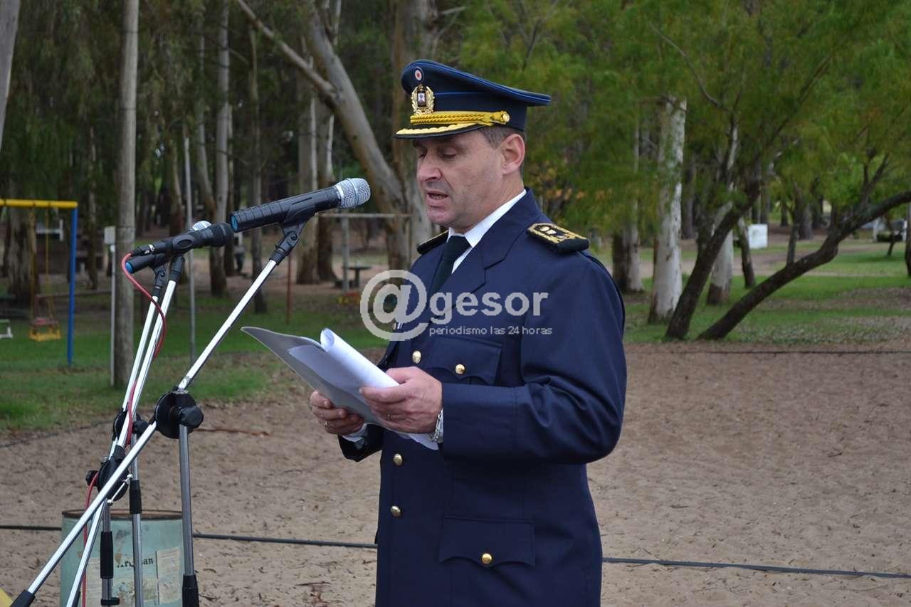 A pesar de la llovizna que por momentos se hacía presente, el acto comenzó puntualmente a las 15 hs. con la entonación del Himno Nacional ejecutado por la banda de la División de Ejército II, luego en la parte el Sub Jefe de Policía de Soriano, Comisario Mayor Leonardo Guardia hizo referencia al hecho histórico conmemorado y resaltó valores patrióticos que se ponen de manifiesto en la actualidad, especialmente ejemplificando con el accionar desplegado en apoyo a la población de dolores tras el tornado del año pasado.