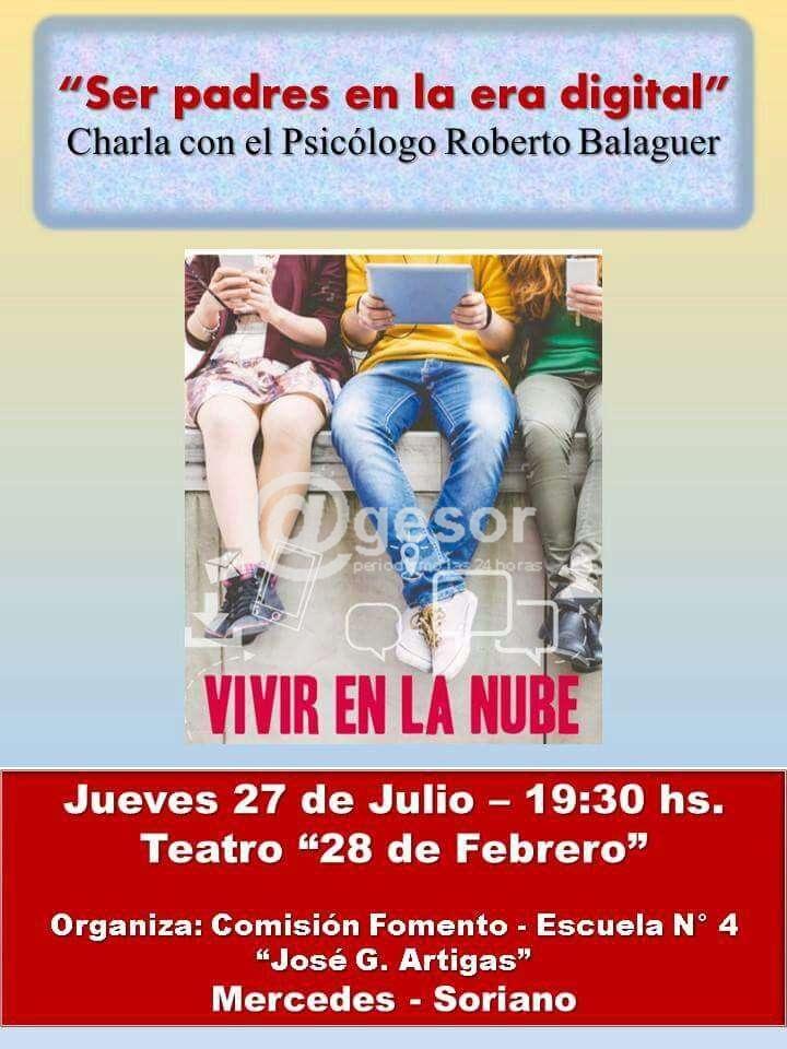 El psicólogo Roberto Balaguer ofrecerá una charla en Teatro 28 de febrero sobre los desafíos de “ser padres en la era digital”. Tal la temática de su último libro “Vivir en la nube”. La actividad es organizada por la Comisión Fomento de la Escuela N° 4, y se realizará el jueves 27 de julio las 19,30 horas, con entrada libre y gratuita.