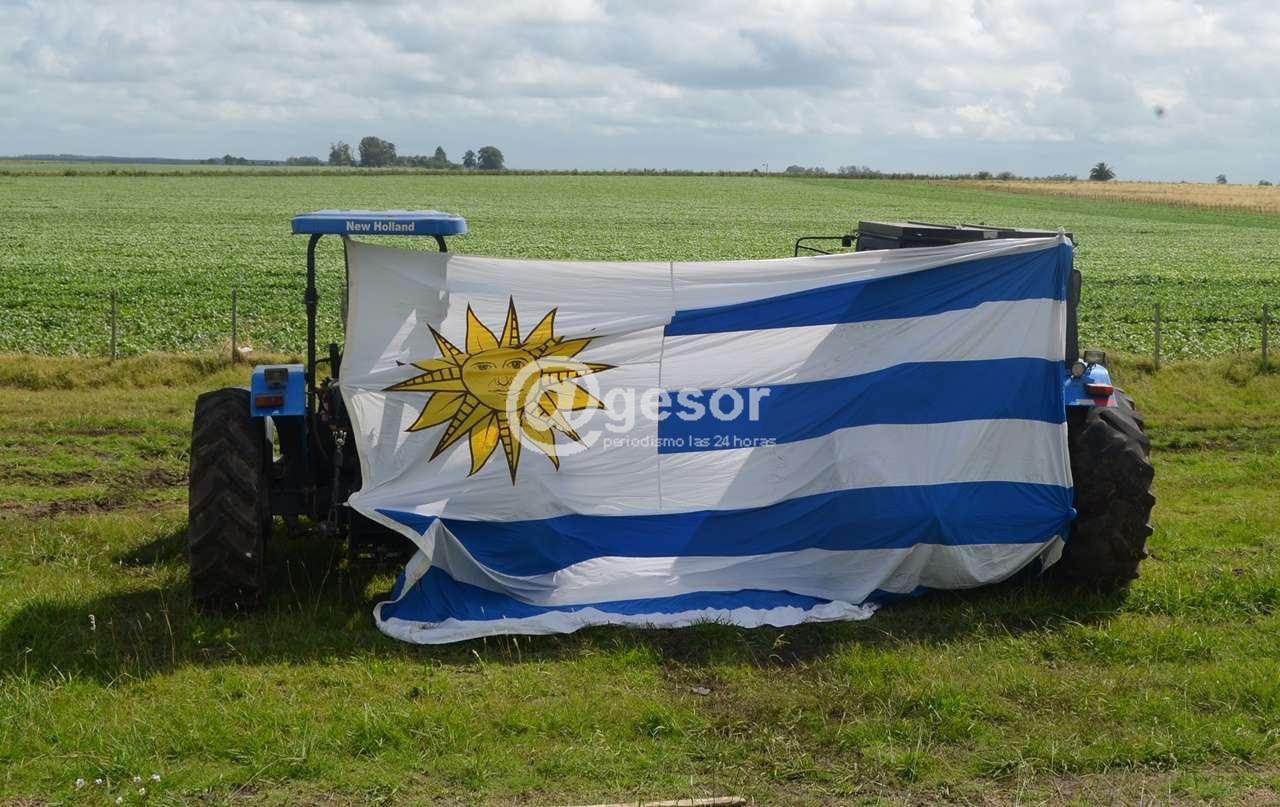 Con carteles y banderas uruguayas sobre sus vehículos productores rurales de Palmitas, Risso, Egaña, Rodó, Cardona y otras zona del departamento se manifestaron en la mañana de este lunes en las afueras de Palmitas. En una grua colgaron un muñeco con ropas de trabajador.