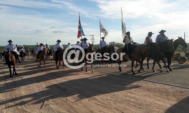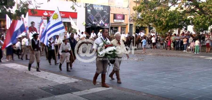Finalmente, en la plaza se procedió a entonarán estrofas del himno nacional uruguayo colocar una ofrenda floral al pie del monumento al gaucho, lo que estuvo a cargo del Sr. César Golly, en representación de la Asociación por Nuestros Hijos y de Williams Martínez en representación de la Aparcería el Cimarrón de Dolores. Una connotación especial que estuvo está marcha, fue la participación de una jovencita de 15 años de edad, ecuatoriana de nacimiento, llamada Valentina Arregin Aguilar que llegó a nuestro departamento para participar de esta marcha. Los integrantes de la Unión de Instituciones Tradicionalistas de Soriano Eugenia Cabrera, Mary Cabrera y Martin Hernández hicieron entrega de un presente.