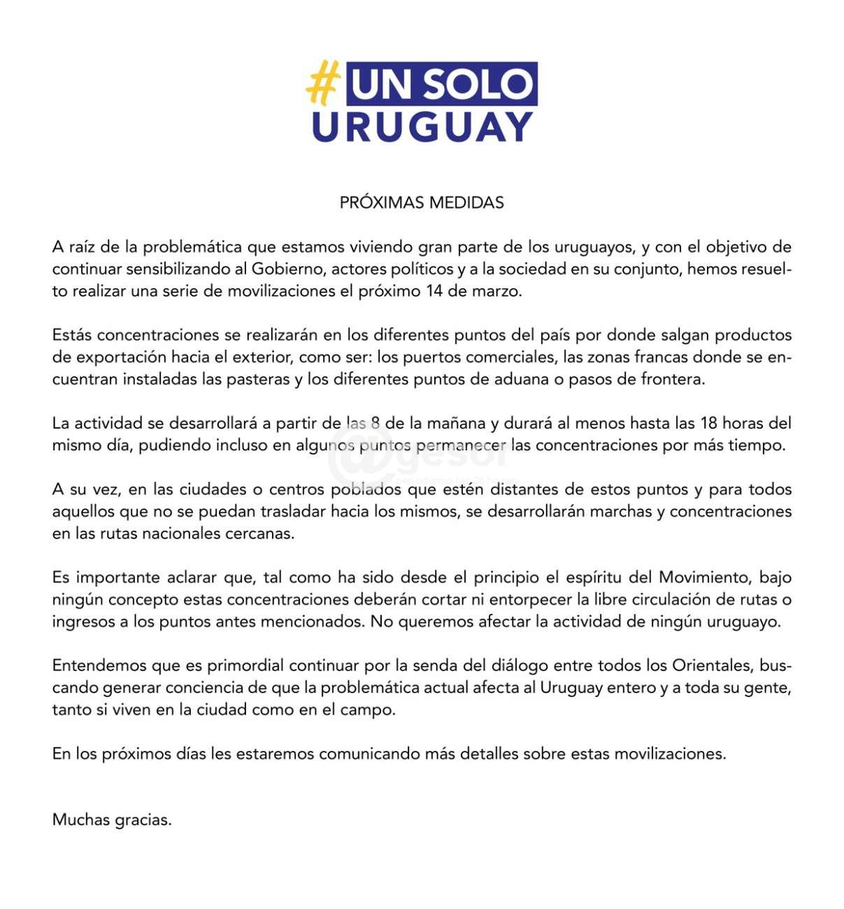 “Un solo Uruguay” anunció nuevas medidas “con el objeto de continuar sensibilizando al gobierno, actores políticos y a la sociedad en su conjunto”. Las mismas serán el 14 de marzo próximo consistentes en concentraciones “donde salgan productos de exportación hacia el exterior, como ser: los puertos comerciales, las zonas francas donde se encuentran instaladas las pasteras y los diferentes puntos de aduana o pasos de frontera”.