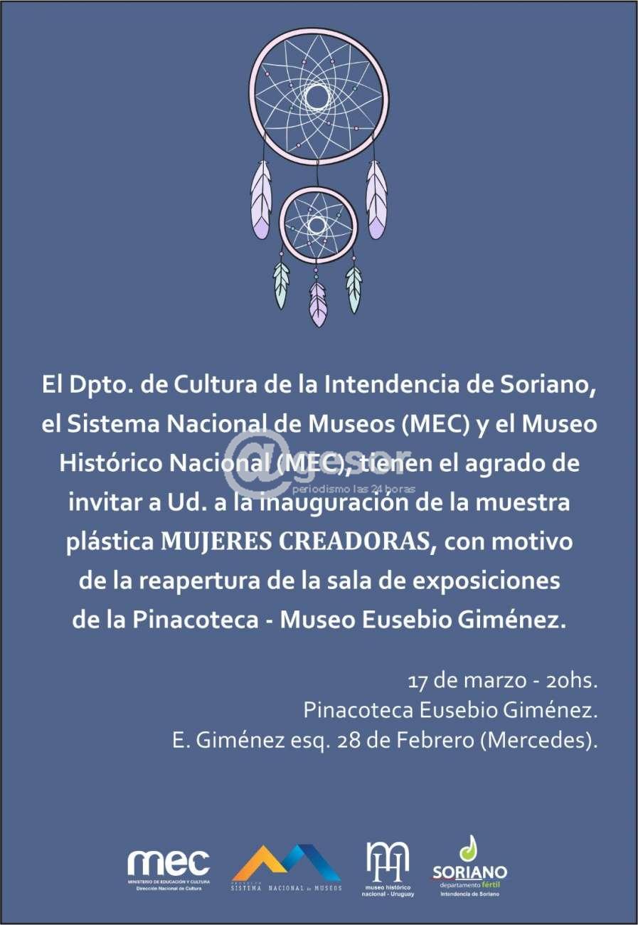 La Pinacoteca de Biblioteca “Eusebio Giménez” reabre su sala de exposiciones con la muestra “Mujeres creadoras -de ayer y hoy”. La misma es impulsada por el Departamento de Cultura de la Intendencia de Soriano, el Sistema Nacional de Museos, y el Museo Histórico Nacional.