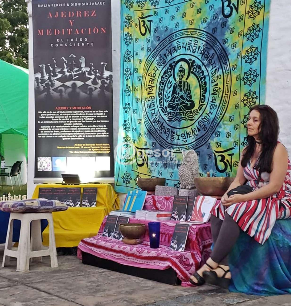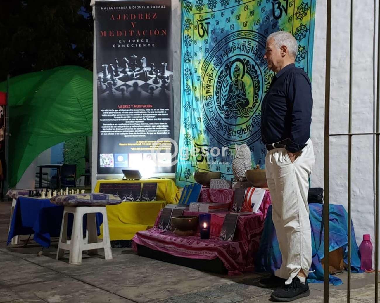 Allí, justo a la entrada a la Manzana 20 por avda. Asencio y Cassinoni, estaba el stand que presentaba, y vendía, el libro Ajedrez y Meditación, el Juego Consciente, atendido por los propios escritores: Malia Ferrer y Dionisio Zarauz.