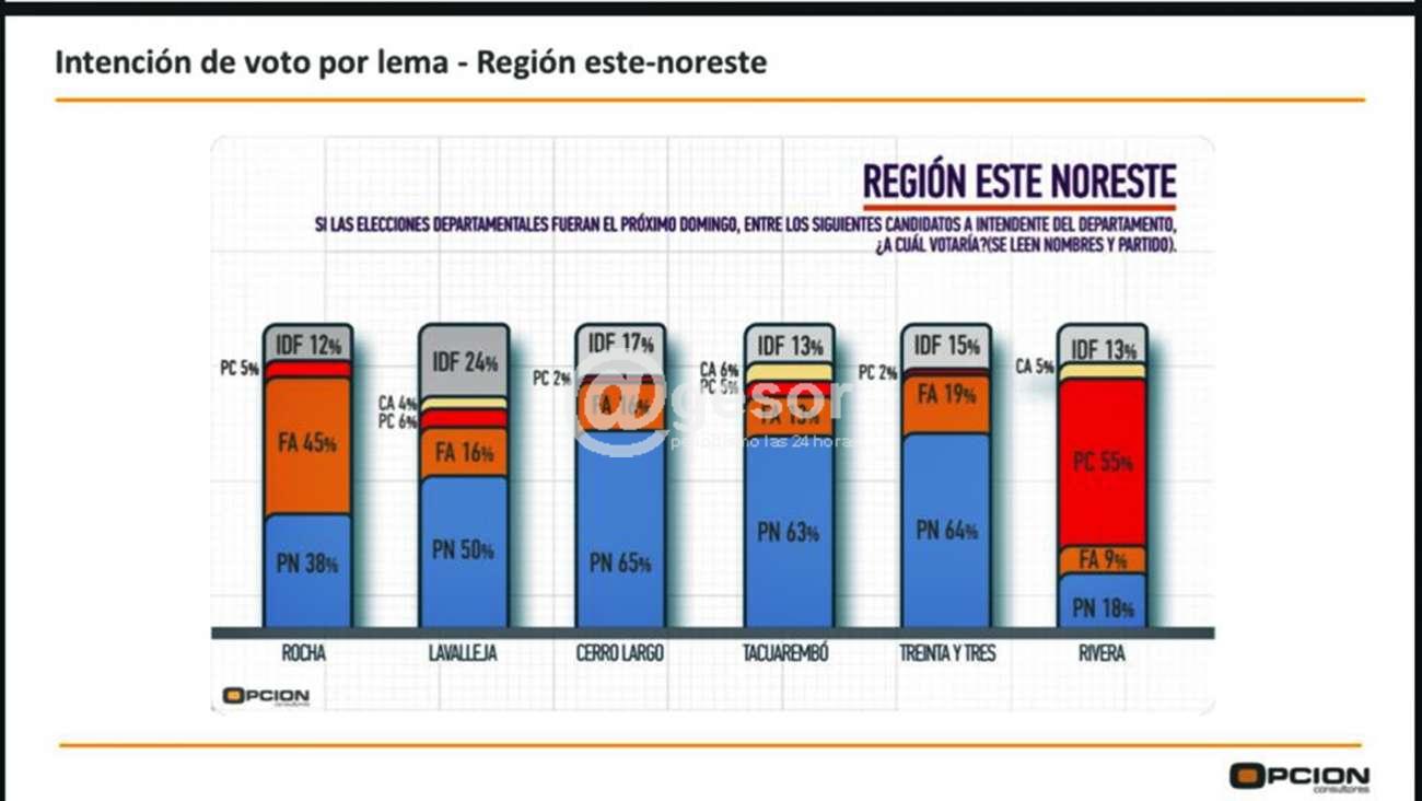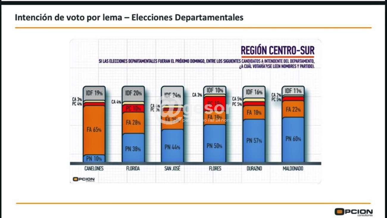 Porzecanski en el detalle general de los 18 departamentos señaló que además de Soriano con Guillermo Besozzi, muestran claro liderazgo tanto por lema como por candidato, que son Canelones con Yamandú Orsi, Durazno con Carmelo Vidalín, Flores con Fernando Echeverría, Artigas con Pablo Caram.