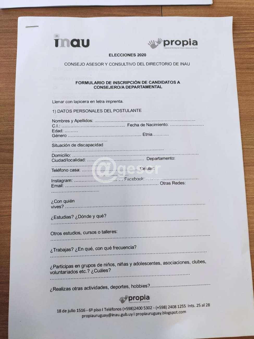 La inscripción para formar parte de la actividad se realiza formalmente al presentar un formulario y consentimiento completos y firmados, junto con la hoja de firmas de apoyo, entre el 31 de agosto y el 11 de setiembre de 2020, en la oficina de la Dirección Departamental de INAU de tu Departamento. (También lo pueden enviar firmado y escaneado por e-mail a:eleccionescac2020@inau.gub.uy).