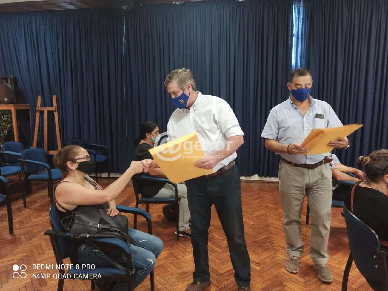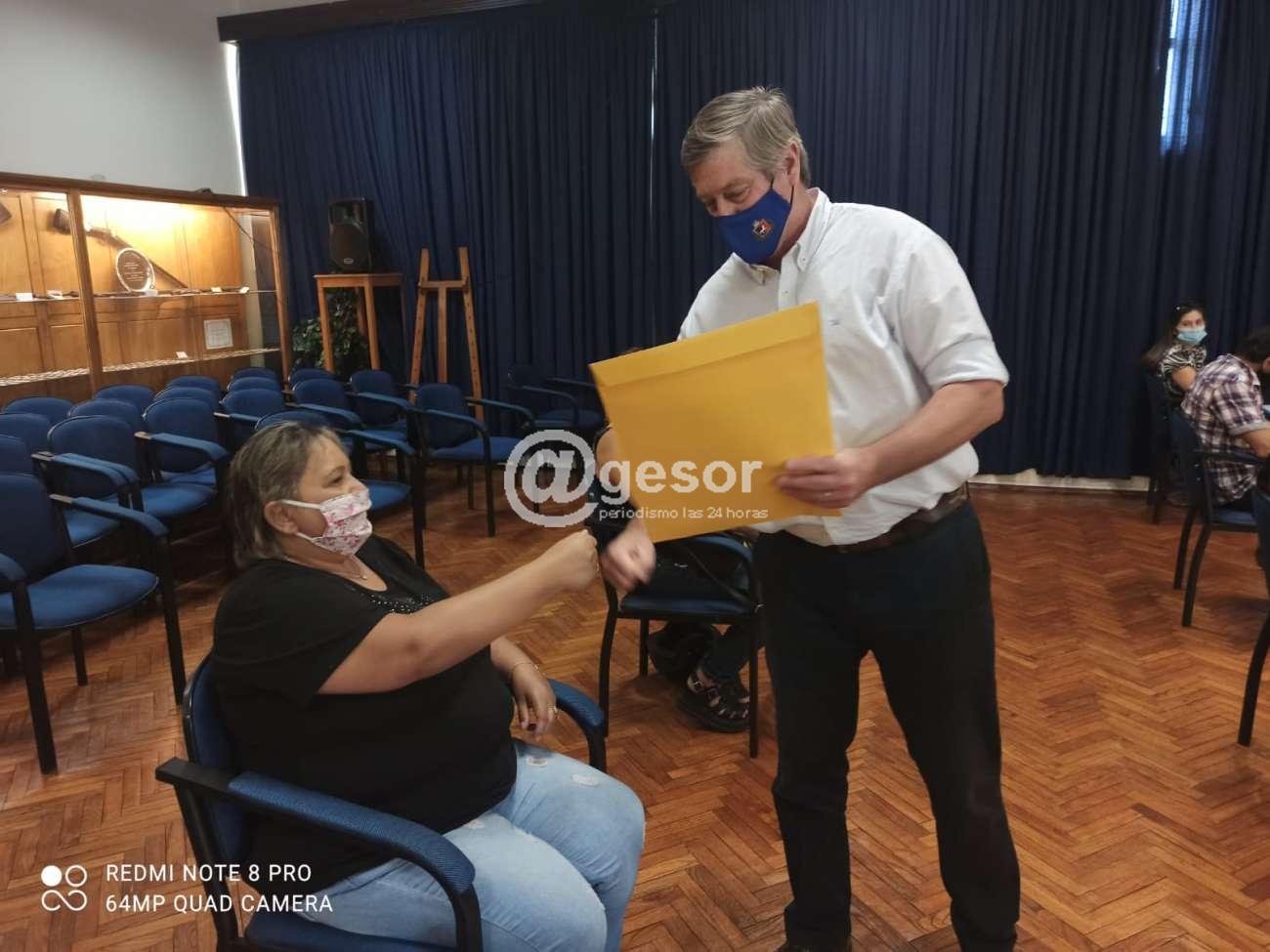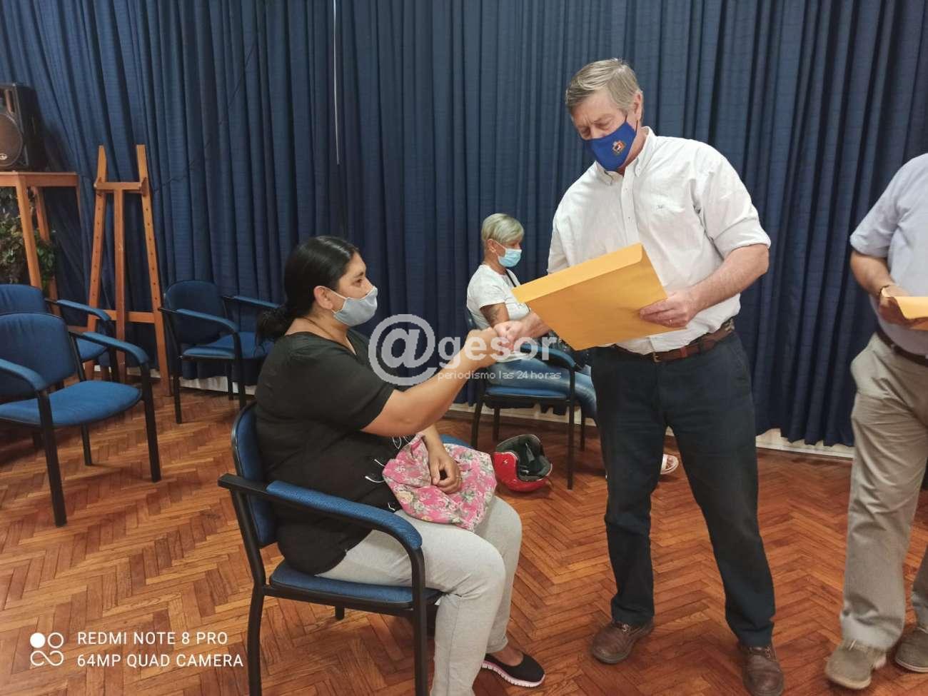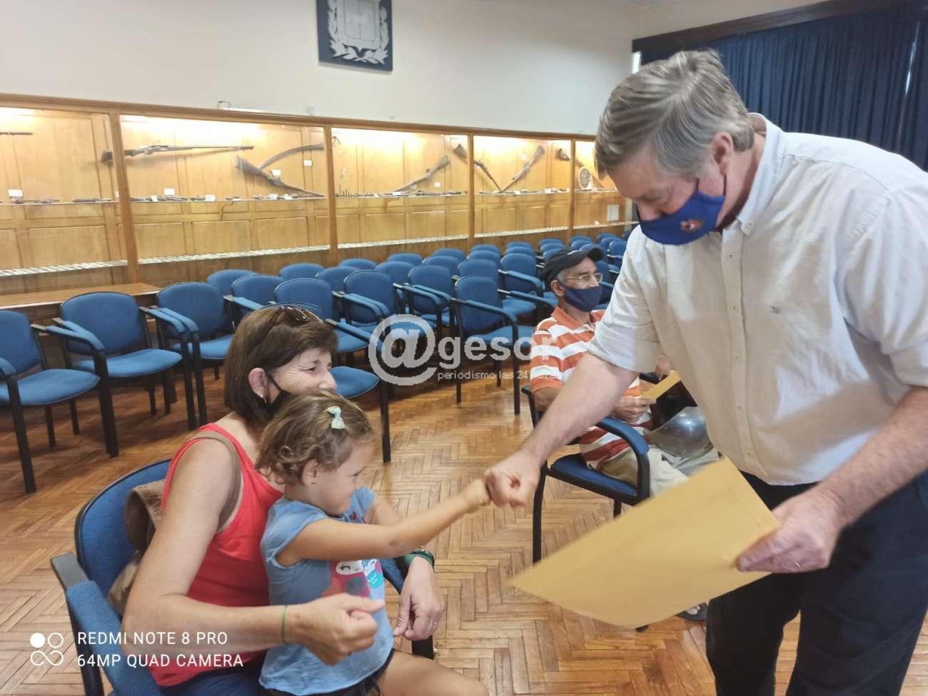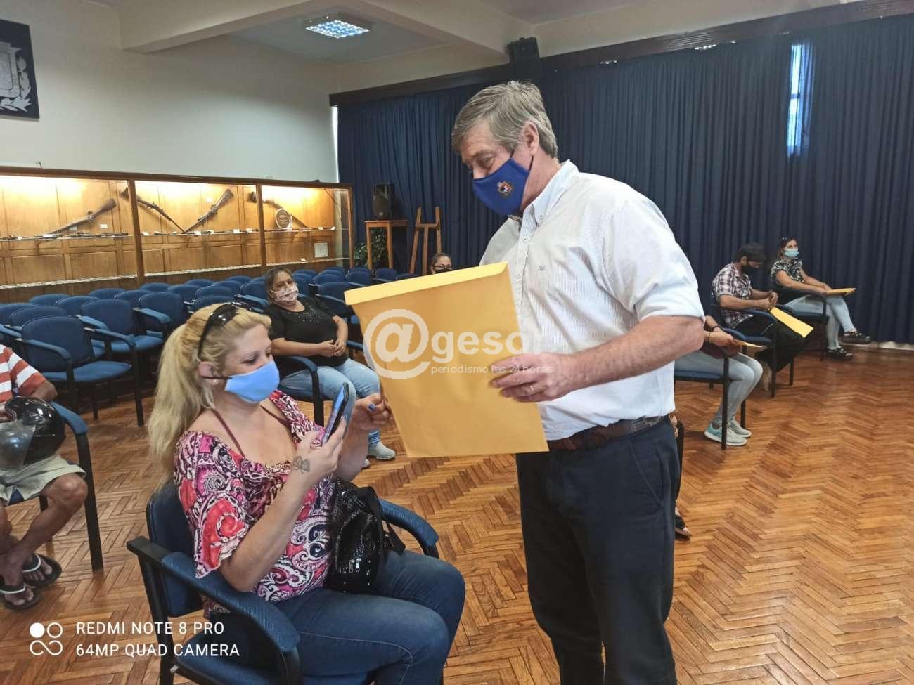 En una instancia muy especial, realizada por tandas en virtud de als medidas sanitarias preventivas, con la presencia de un representante por familia, fueron recibiendo en manos del propio Intendente, el sobre con los documentos que acreditan la titularidad de la propiedad.