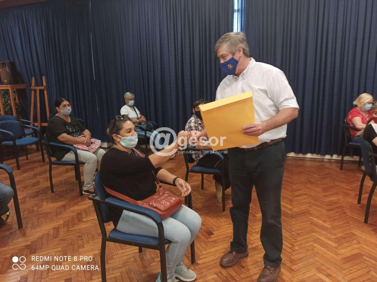Doña María Teresa Mesa había recibido el sobre con la documentación que acredita que es propietaria de la vivienda que habita en el barrio Nuevo Amanecer junto a su esposo Sergio Martínez Careaga, por razones de prevención sanitaria en el actual contexto de pandemia, sólo un integrante de la familia pudo ingresar al salón de actos "Eduardo Víctor Haedo" de la Intendencia de Soriano, para recibir de mano del jefe comunal Guillermo Besozzi, el título de propiedad.