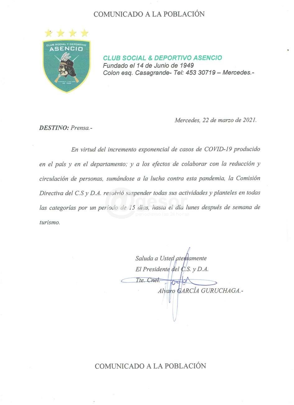 El Club Asencio emitió un comunicado anunciando que suspende todas las actividades deportivas hasta después de la semana de turismo.