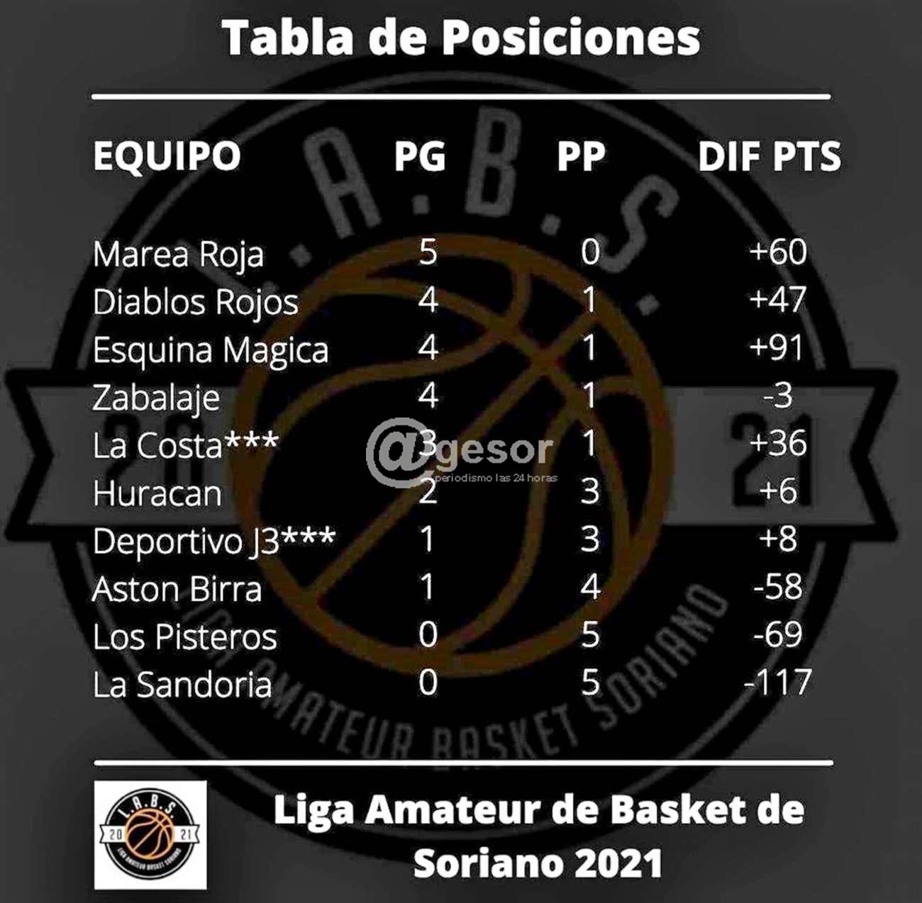 Adjunto a esta nota la tabla de posiciones que encabeza Marea Roja con 5 juegos ganados, seguido por Diablos Rojos, Esquina Mágica y Zabalaje con 4, La Costa 3 (con un partido menos), Huracán 2, Aston Birra y Deportivo J3 1 (este con un partido menos), cierran Los Pisteros y La Sandoria sin juegos ganados.
