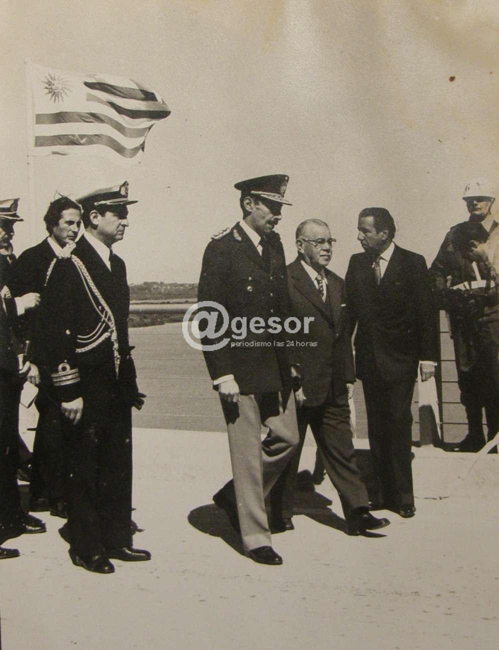 Foto 2: todo un símbolo de las dictaduras rioplatense. Los dictadores Jorge Rafael Videla (argentina), y Aparicio Méndez (Uruguay) durante la inauguración del puente de Fray Bentos. Secundándolos el Canciller Juan Carlos Blanco. (Archivo @gesor)