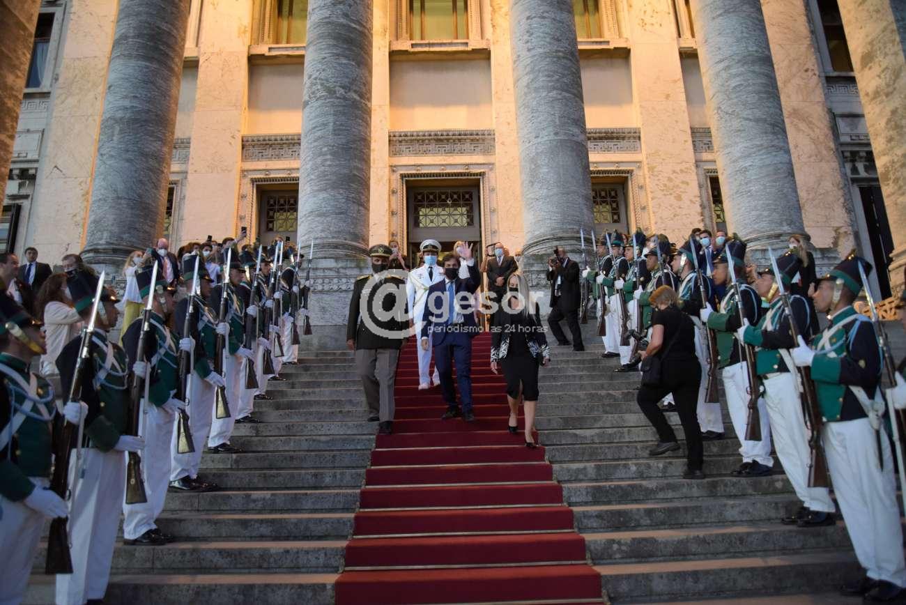 El Presidente Dr. Luis Lacalle Pou ingresó por la puerta principal del Palacio Legislativo escoltado por la Directora de Protocolo y Relaciones Públicas de la Comisión Administrativa, Esc. Paola Clavarino, y por el Jefe de la Casa Militar, General César Ifrán. En la puerta principal del edificio lo recibieron la Presidenta de la Asamblea General, Esc. Beatriz Argimón y el Presidente de la Cámara de Representantes, Dr. Ope Pasquet.
