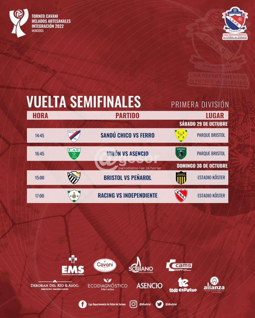 Para finalizar se definió la fecha del fin de semana, el sábado para no pagar multas, juegan en cancha de Bristol hora 14 y 45 Sandú Chico vs Ferro y hora 16 y 45 Unión vs Asencio, mientras que los partidos de vuelta de las semifinales, se juegan el domingo hora 15 Bristol vs Peñarol y a la hora 17 Racing vs Independiente.