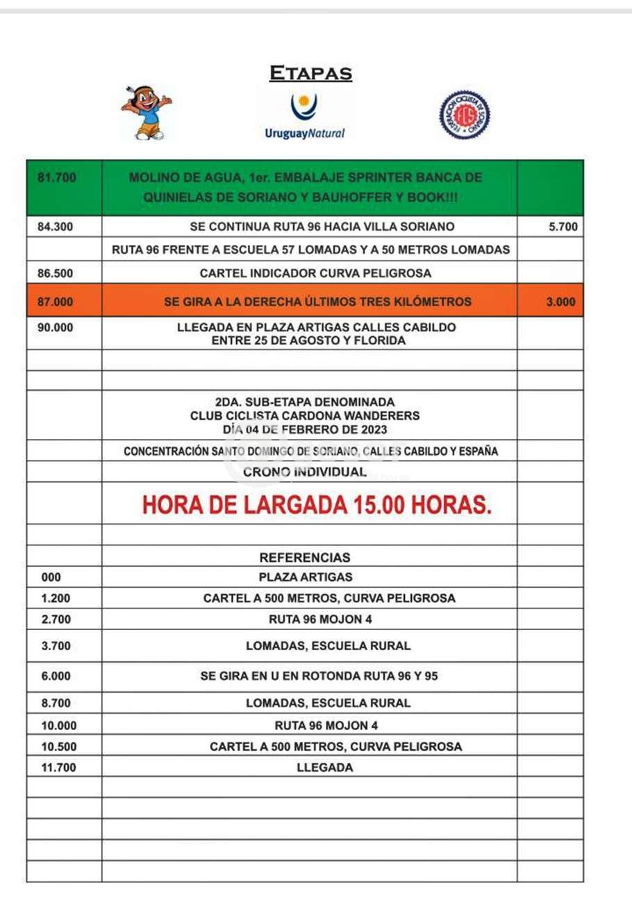La segunda parte de la etapa que se denomina Club Ciclista Cardona Wanderers será la contra reloj individual, con punto de concrentación en Villa Soriano, más precisamente en calles Cabildo y España, con hora de largada a las 15.00 horas.