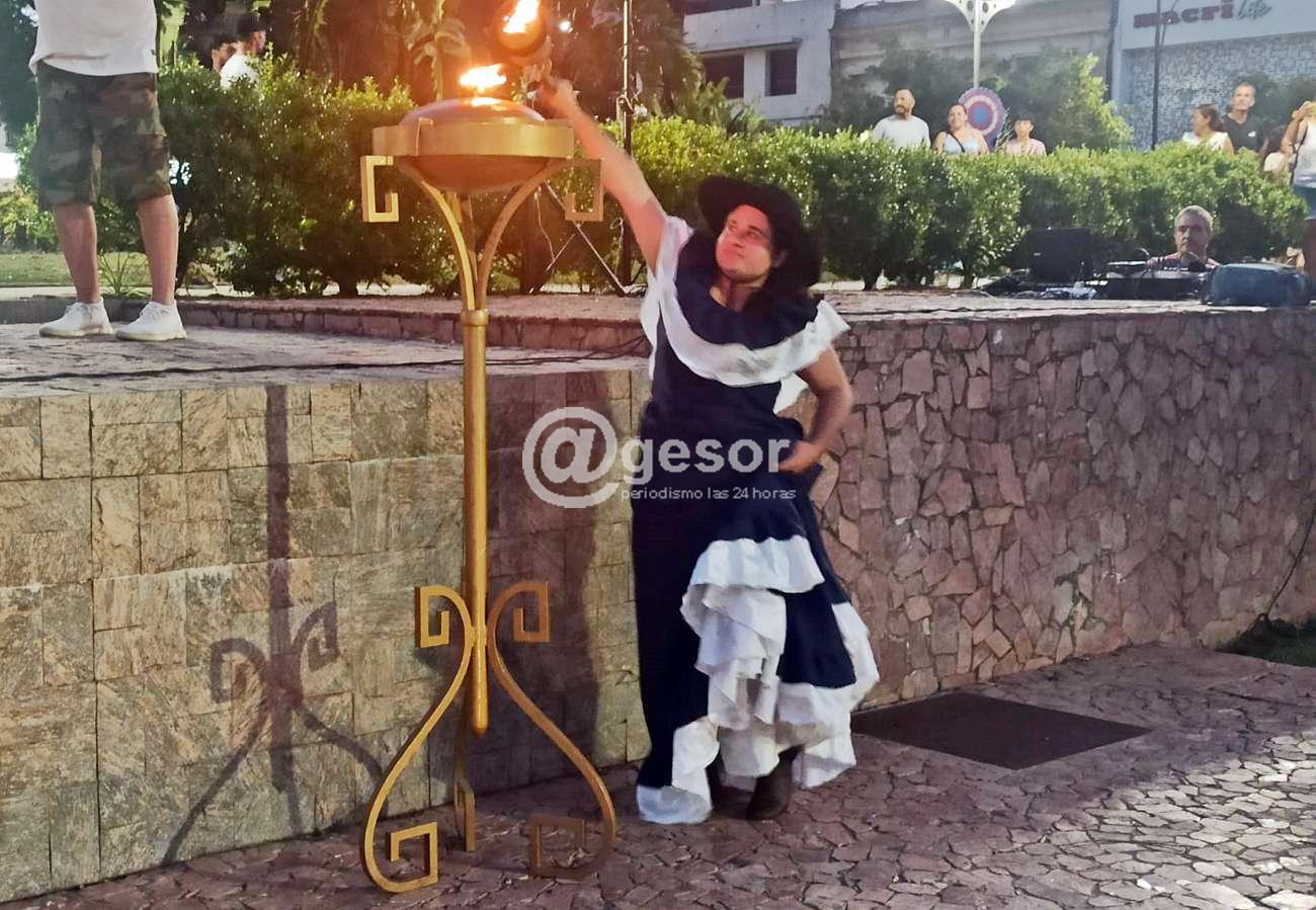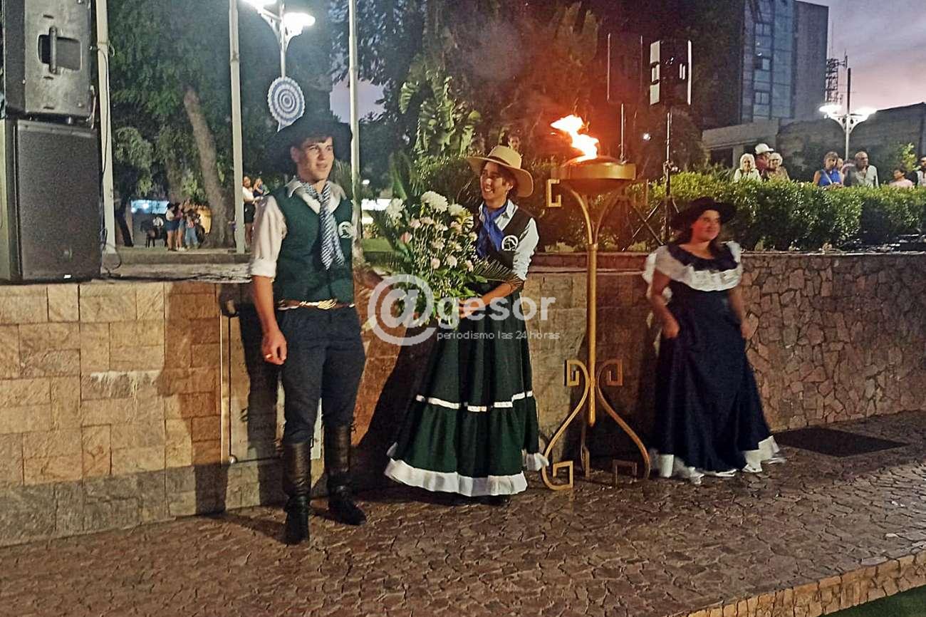 En plaza Independencia con importante marco de público, inicialmente se procedió al encendido del pebetero, transportando la antorcha la representante de la Unión de Instituciones Tradicionalistas de Soriano, Eugenia Cabrera, quien la encendió y luego junto a ella, otros rpresentantes de las instituciones organizadoras de la marcha, colocaron ofrenda floral junto al monumento al Gaucho.