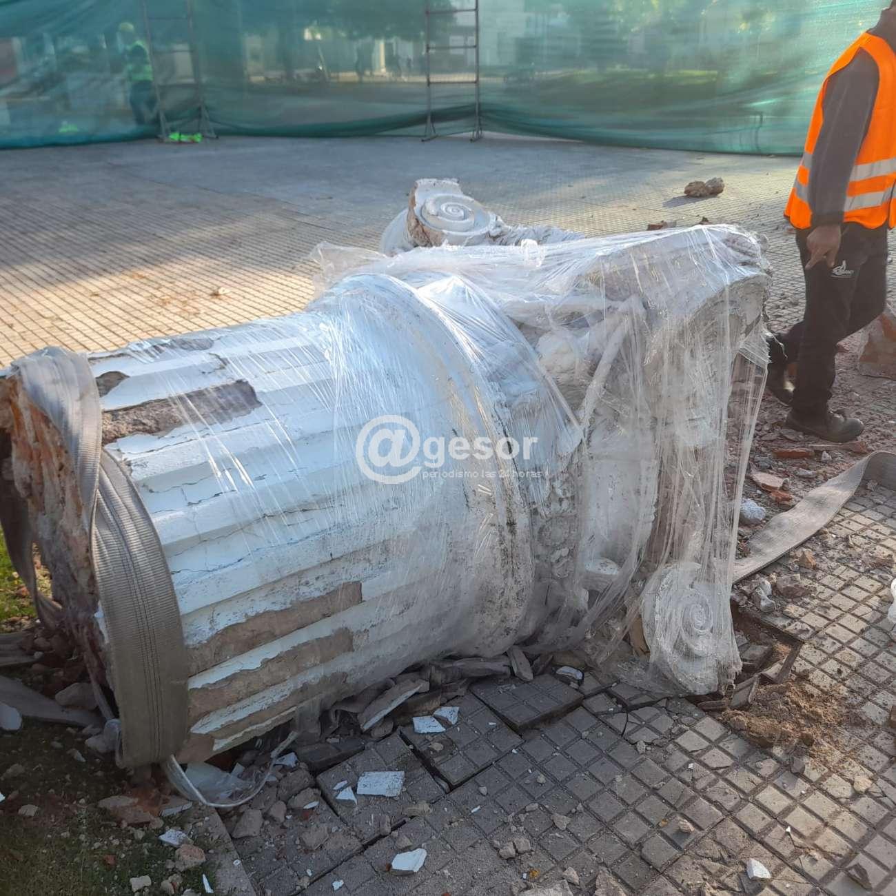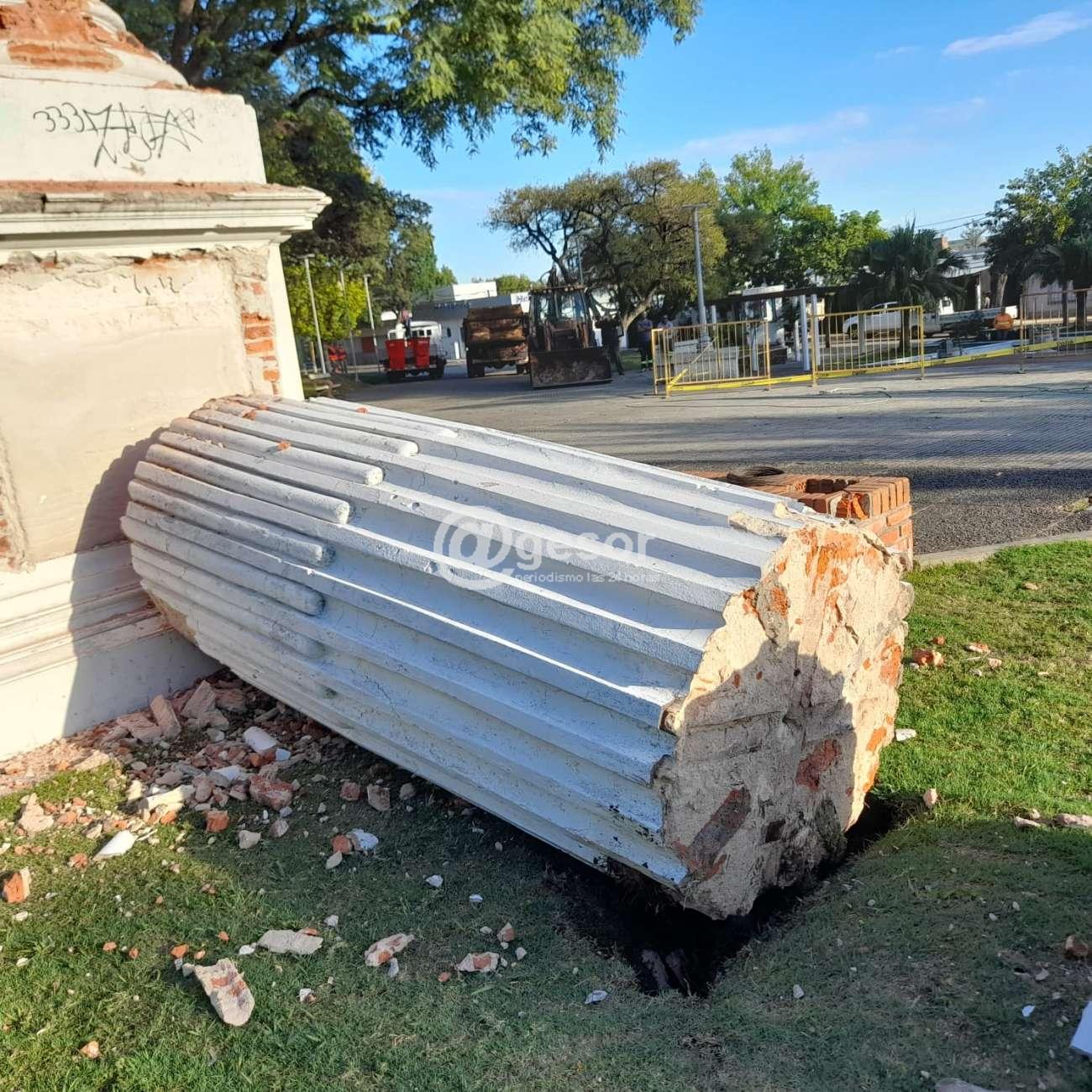 Tal es así que este martes y mediante un paciente trabajo se realizó la demolición de la columna, cuyos escombros fueron retirados para dar paso a las obras para emplazar la réplica que se viene confeccionando. La intervención contó con todas las medidas de seguridad, tanto para el personal como para las personas en general. En este sentido se ha colocado un doble vallado de seguridad para evitar la circulación por el centro de la plaza.