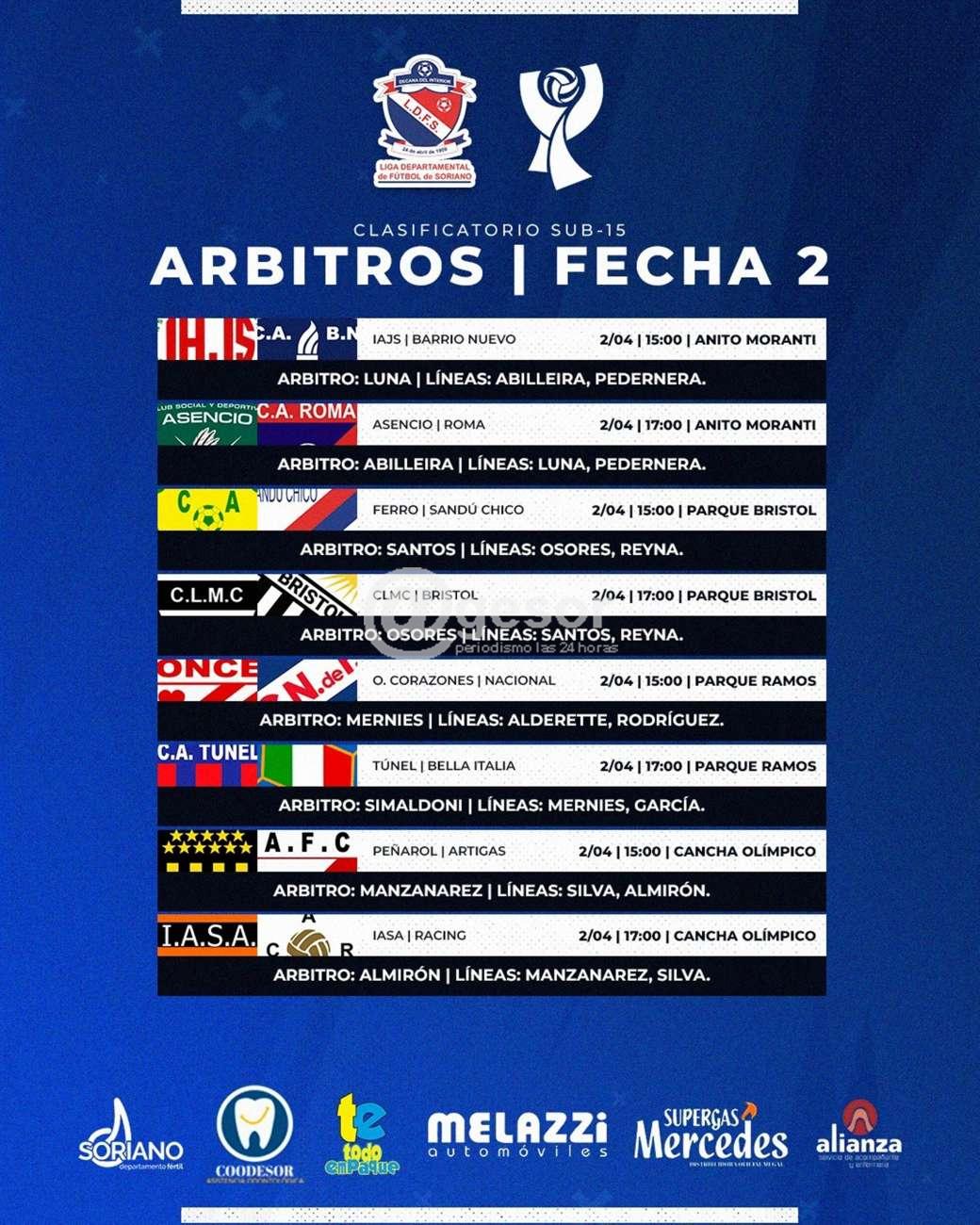Se fijaron detalles de la segunda fecha del Clasificatorio de Sub 15 de la Liga Departamental de Fútbol de Soriano, así como las ternas designadas por el Colegio de Arbitros para esta segunda jornada del torneo, detalles que pueden encontrarse en las fotografías adjuntas.
