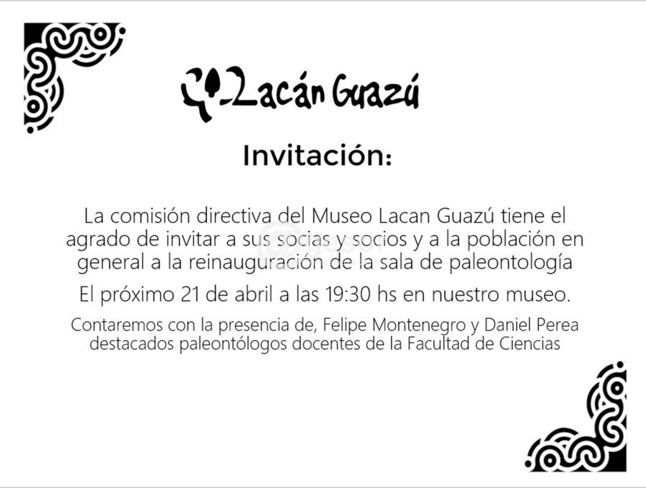 La Comisión directiva del Museo Lacán Guazú está invitando a sus socias y socios y a la población en general a la reinauguración de la sala de paleontología.