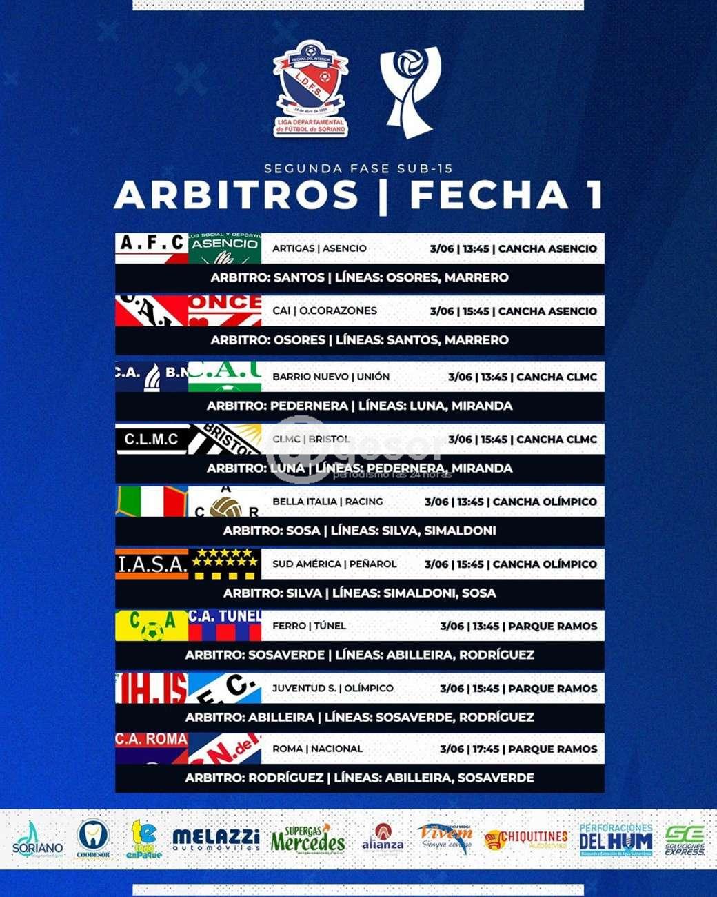 El Colegio de Arbitros de la Liga Departamental de Fútbol de Soriano realizó las designaciones de las ternas arbitrales que estarán conduciendo los encuentros correspondientes a la segunda fecha del Torneo Integración "Perforaciones del Hum" en primera división, que estará jugándose durante este domingo 4 de junio en forma completa, incluyendo el clásico entre Olímpico y Con Los Mismos Colores a las 11.00 horas en el estadio "Luis Köster" para la televisación a través de CV10.