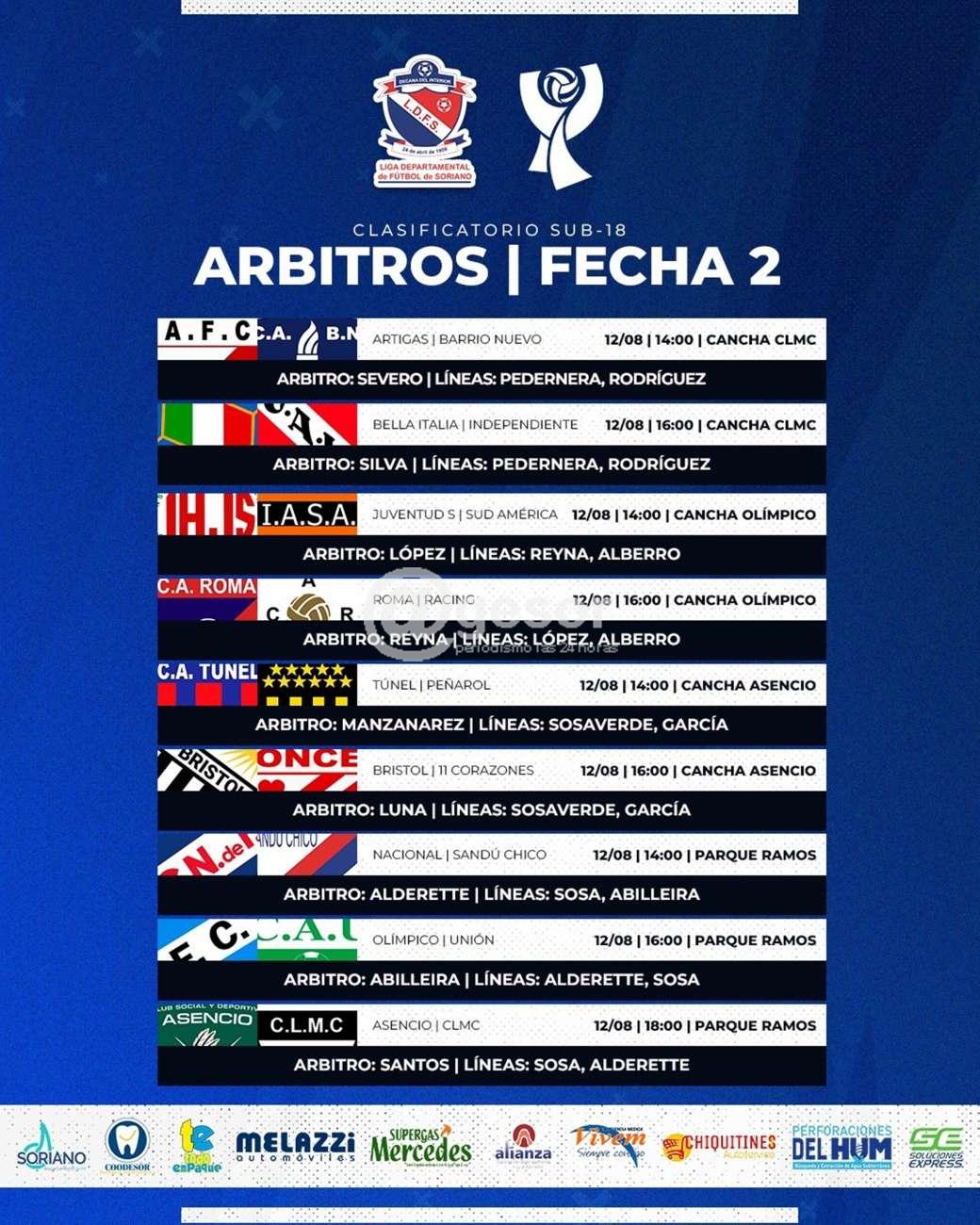 El Colegio de Arbitros de la Liga Departamental de Fútbol de Soriano dio a conocer las ternas que conducirán los encuentros de las 12ª fecha del Clasifcatorio "Perforaciones del Hum" en el fútbol mercedario en primera división, que se disputará íntegramente este domingo 13.