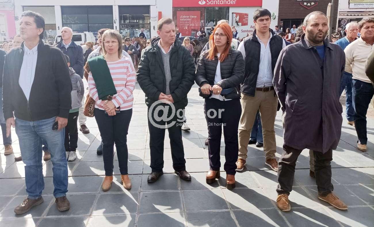 Tras recibirse a los cientos de marcheros de la 14ª edición de la marcha "Aquí Nació la Patria", y mientras se desarrollaba preludio musical a cargo de la Orquesta "Mercedes", fueron arribando las diferentes autoridades encabezadas por el Intendente Guillermo Besozzi, la Presidenta de la Junta Departamental de Soriano, Andrea Nievas y ediles varios, los Diputados María Fajardo y Enzo Malán (Martín Melazzi envió mensaje), autoridades y delegaciones representando a la Jefatura de Policía de Soriano, Prefectura Nacional Naval, Batallón "Asencio" de Infantería Nº 5, Destacamento de Bomberos de Mercedes y de Colonia, Obispo Diocesano Monseñor Carlos María Collazzi, autoridades de la Asociación Patriótica de Soriano encabezadas por Bernardo Urchipía, delegaciones de distintas aparcerías y también delegaciones de instituciones estudiantiles, además de público en general.