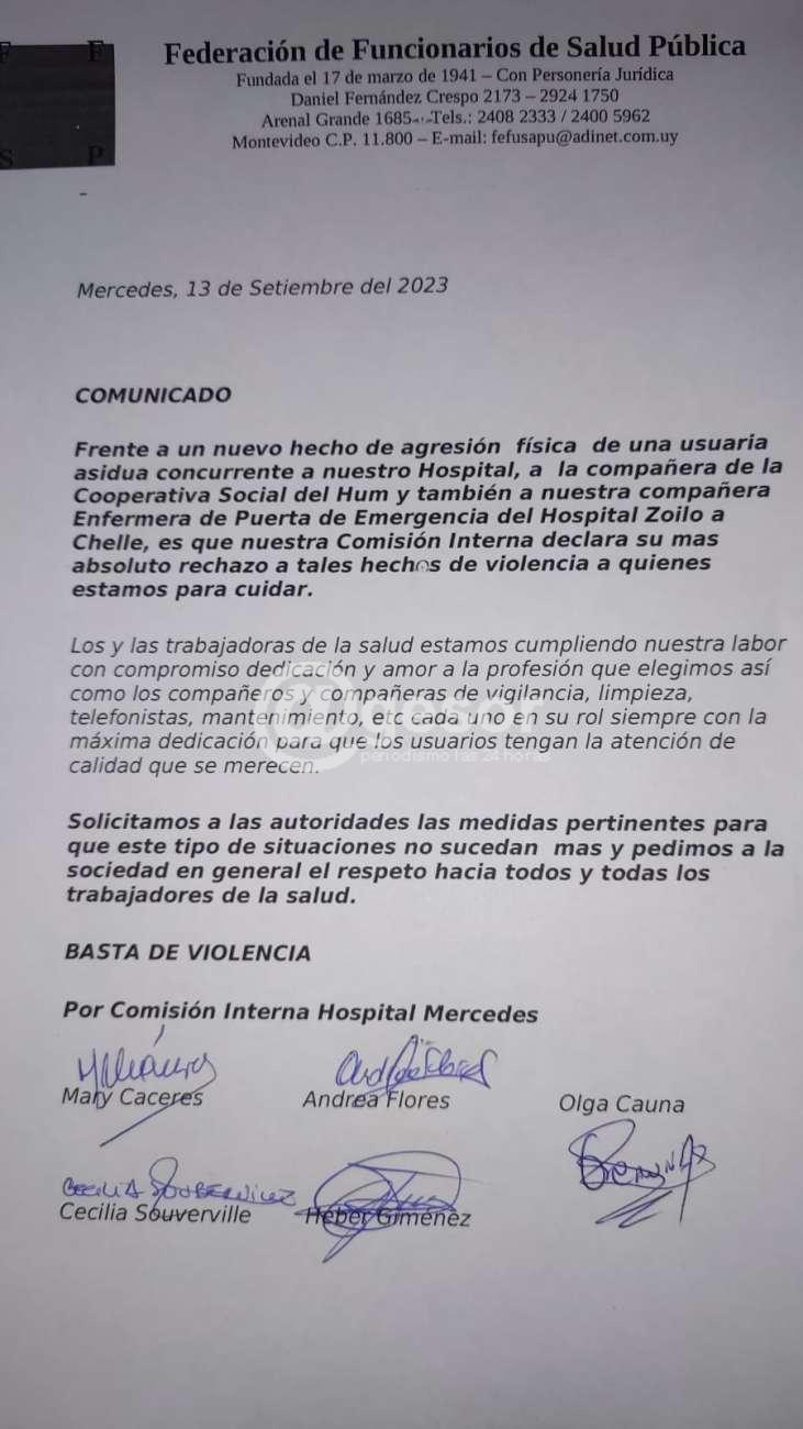 “Frente a un nuevo hecho de agresión física de una usuaria asidua concurrente a nuestro Hospital, a la compañera de la Cooperativa Social del Hum y también a nuestra compañera Enfermera de Puerta de Emergencia del Hospital Zoilo A Chelle, es que nuestra Comisión interna declara su más absoluto rechazo a tales hechos de violencia a quienes estamos para cuidar.