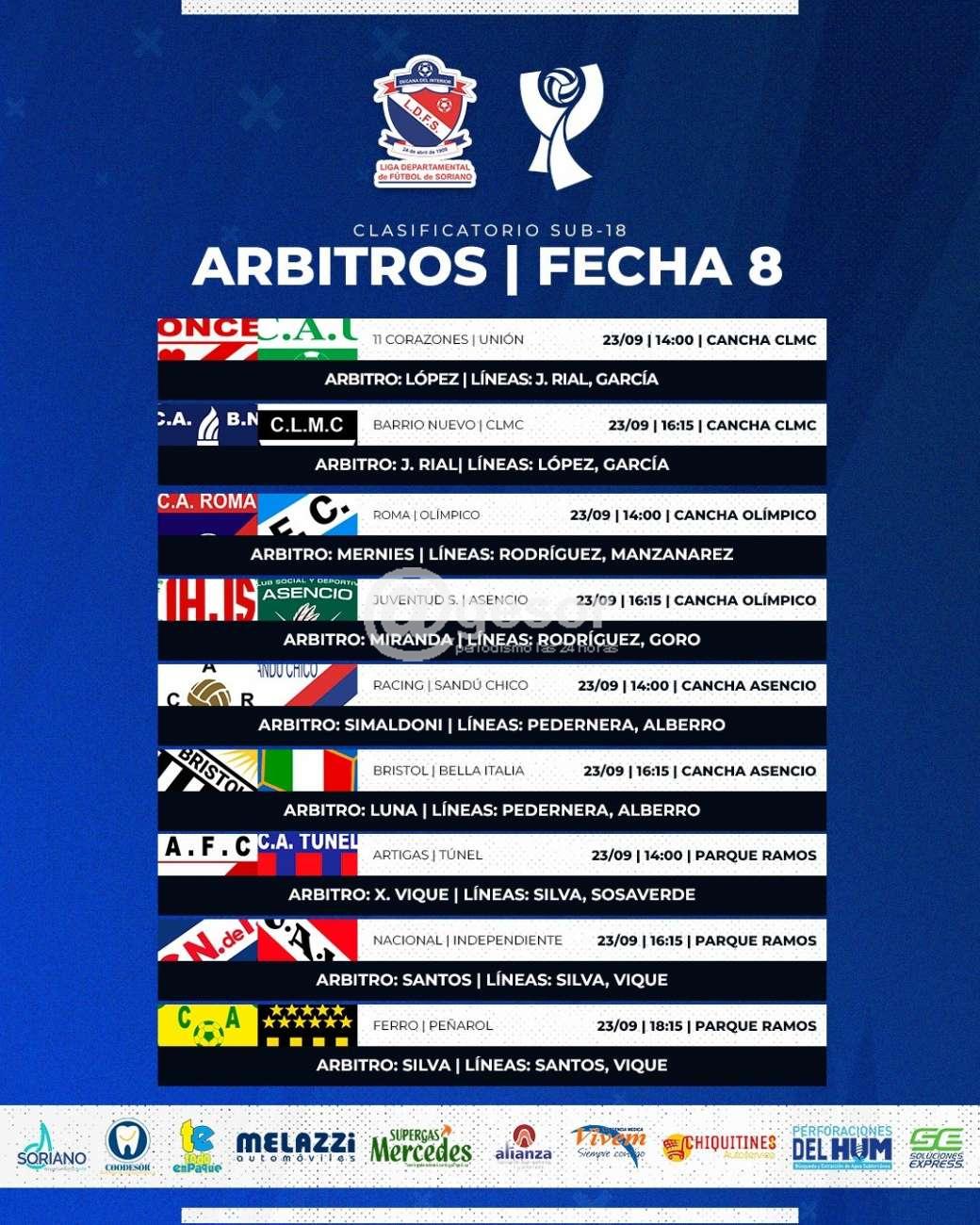 El Colegio de Arbitros de la Liga Departamental de Fútbol de Soriano, dio a conocer las ternas que estarán conduciendo los encuentros de la 17ª fecha del Clasificatorio "Perforaciones del Hum" del fútbol mercedario en primera división.
