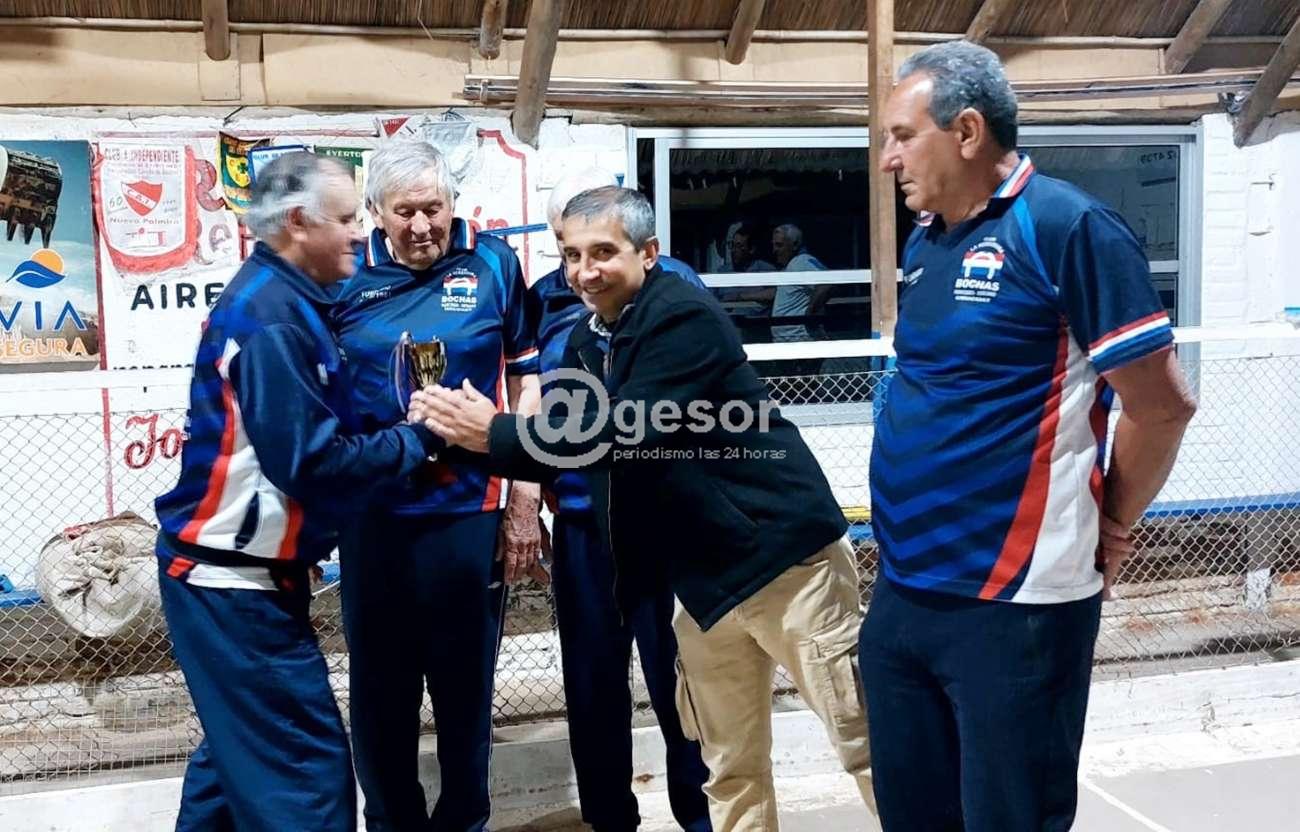 Freddy Planchón en nombre de la Federación de Bochas de Soriano entregó el trofeo al campeón que aportó el club San Lorenzo.