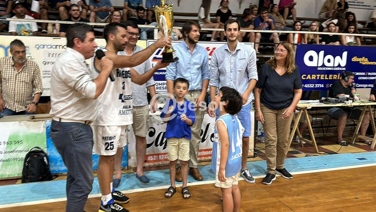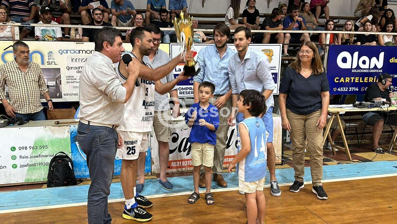 En el entretiempo del clásico del básquetbol mercedario en el marco de la segunda fecha de la segunda fase del Campeonato Competencia de la Liga Regional de Básquetbol de Soriano, el Presidente de la Liga, Andrés Centurión, junto a familiares de Marisa de Pazos, cuyo nombre llevaba la copa, se la entregaron al capitán del Club Remeros Mercedes, Facundo Siniestro.