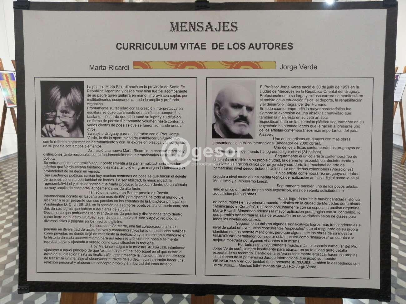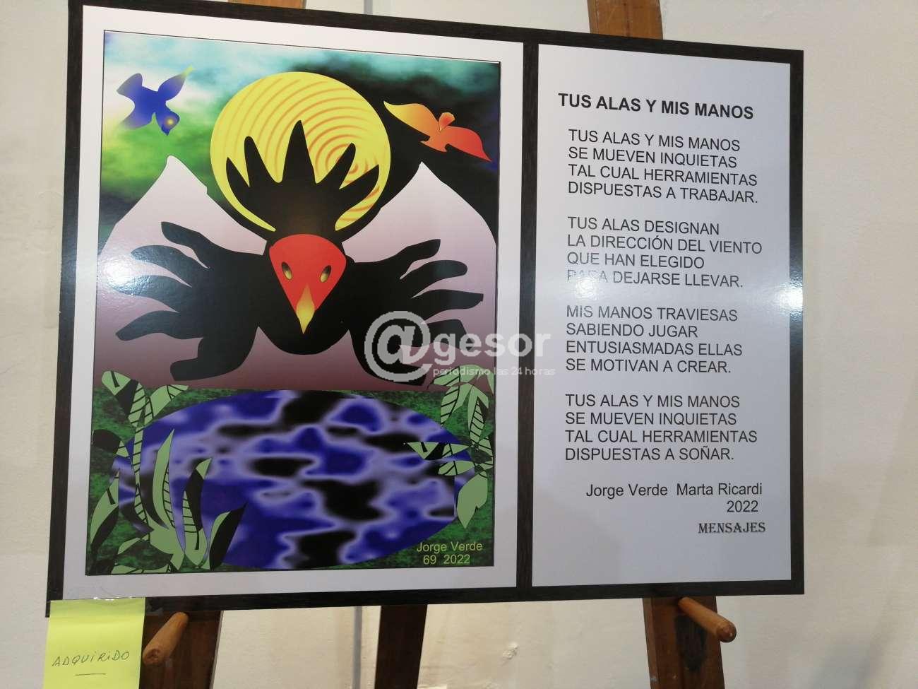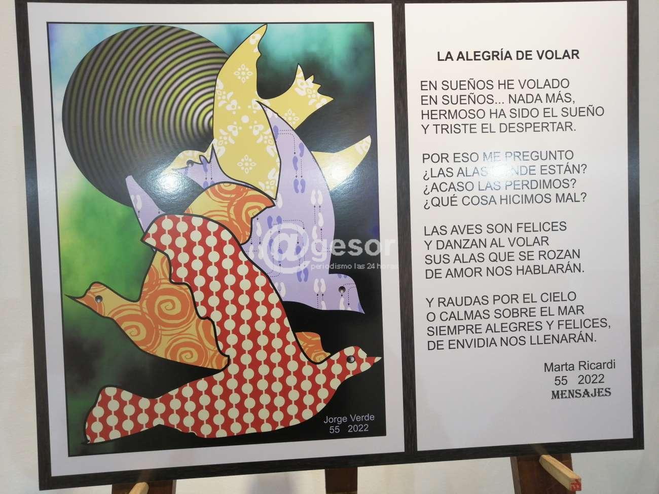 Permanece abierta en Casa de la Cultura de Mercedes la muestra "Mensajes" una conjunción entre arte digital y poesía. Como adelantáramos esta muestra la realizan Jorge Verde (plástica) y Marta Ricardi (poesía) resumiendo una serie de trabajos con variada temática, que van desde imágenes o semblanzas de situaciones cotidianas, a mensajes de actualidad, movilizados por hechos dolorosos como la guerra entre Ucrania y Rusia.