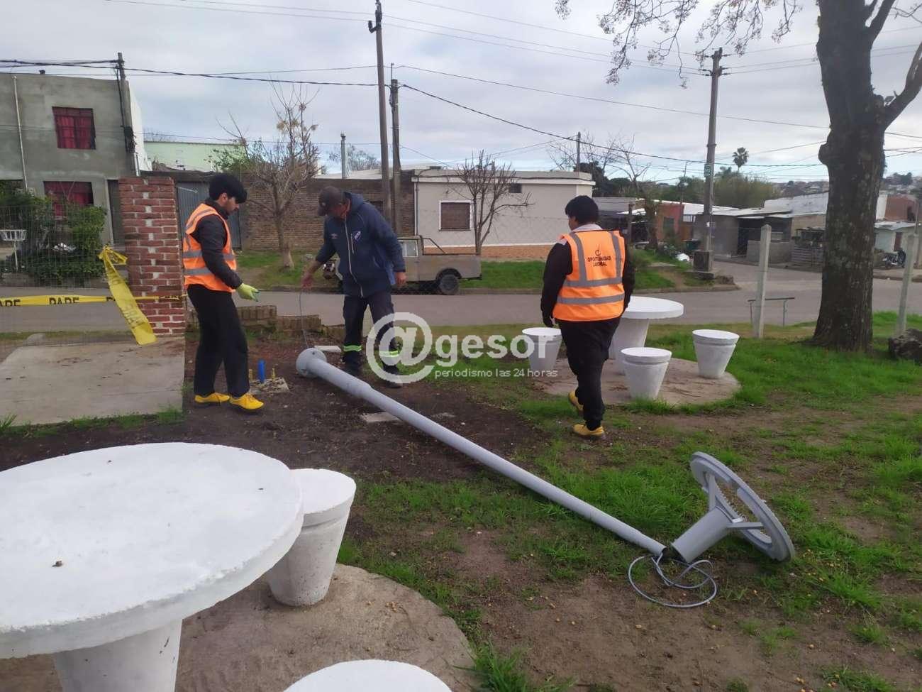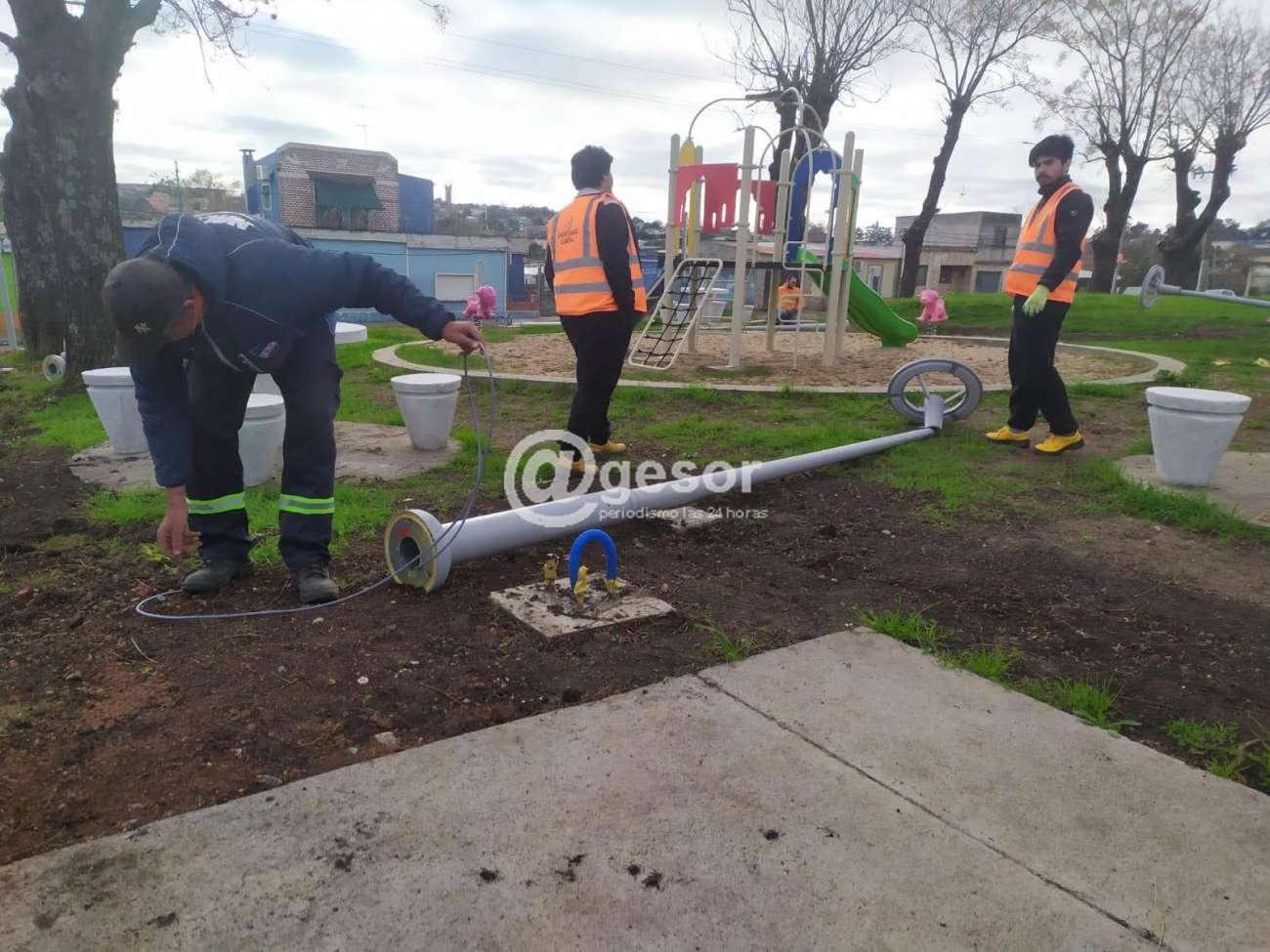 Se prepara el nuevo sistema de iluminación, por lo que se colocan columnas de 4 m. de altura para los senderos y los sectores con mesas y asientos.