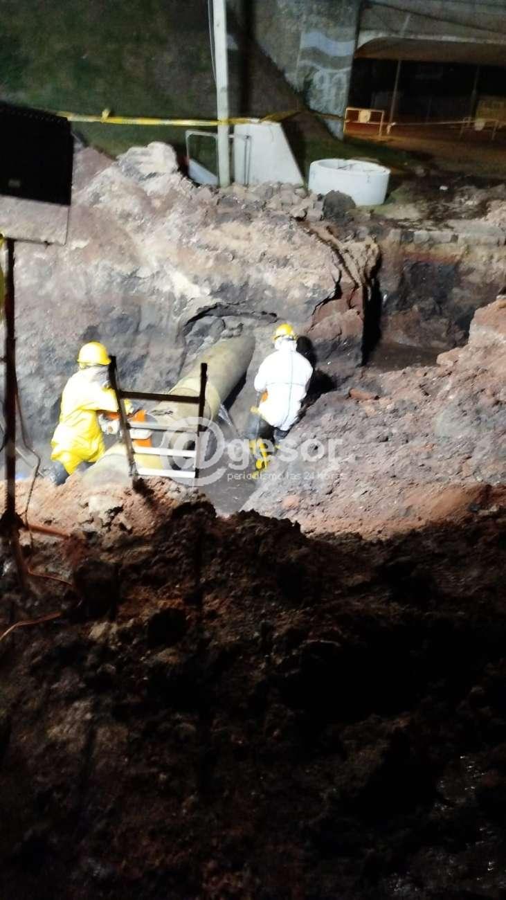 Los funcionarios extrajeron el agua del pozo que debió abrirse para trabajar y descubrir totalmente la tubería que había quedado tapada por el agua, y se estaba desarrollando los cortes correspondientes para colocar un tramo nuevo y poder solucionar la rotura.