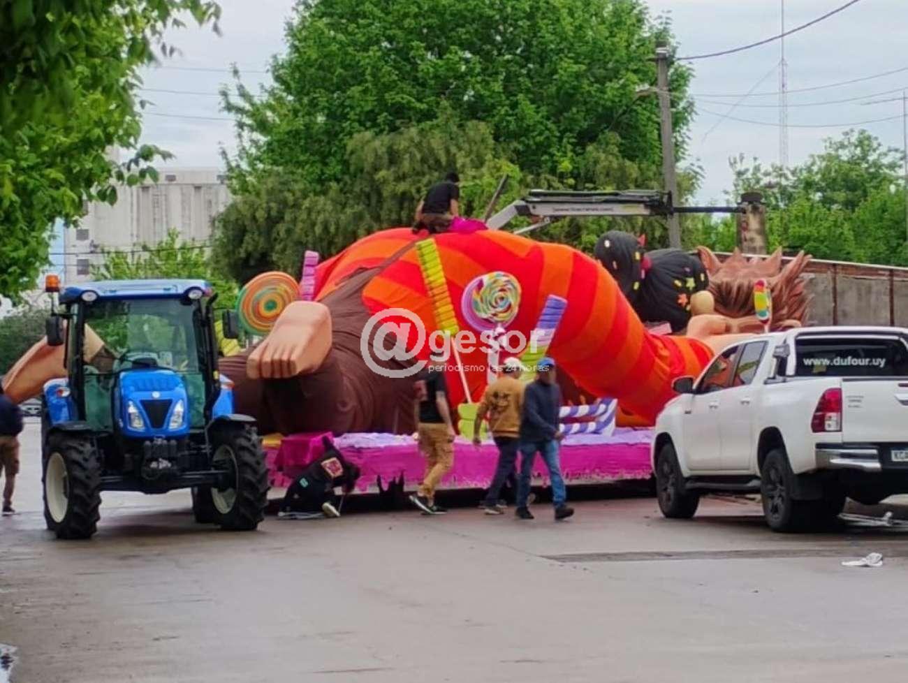 Para ello también se tuvo en cuenta que los carros estaban guardados en sus galpones y restaba culminar el armado, con aquellas partes que se colocan con el carro ya en la calle, como lo muestra la fotografía de la carroza del grupo de UTU que en su local de Río Negro casi Iris de López Crespo, a las 12.24 horas con un guinche se aprestaba a colocar la cabeza a la figura del personake principal, para poder estar prontos para las 14.00 horas e iniciar el desfile, que como siempre concita la atención de miles de personas de la región.