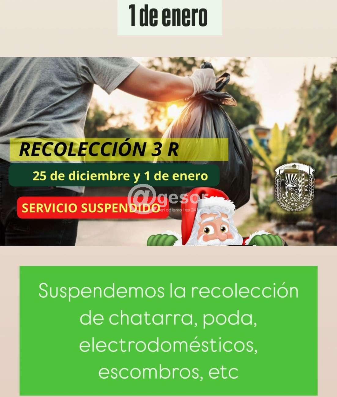 De igual manera este miércoles 1 de enero, se suspende el servicio de Recolección 3R que incluye chatarra, poda, electrodomésticos, escombros, etc.