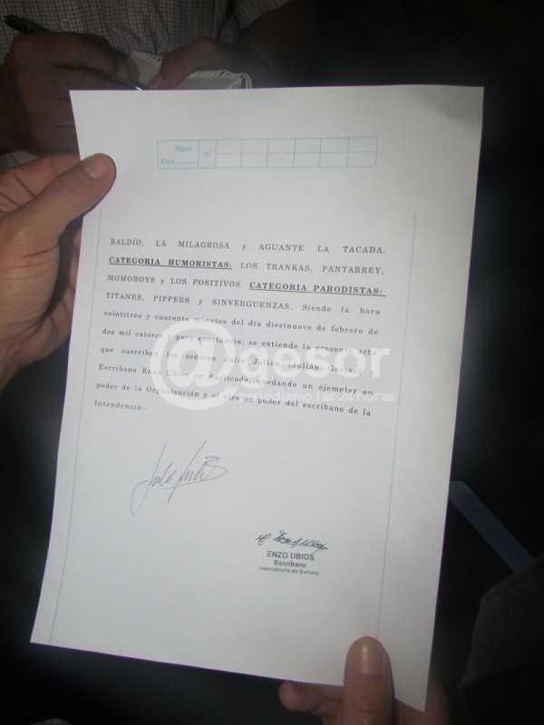(por Martín Corujo) Ya pasada la medianoche, en los primeros minutos de este jueves, el Presidente del Jurado del Concurso Oficial de Agrupaciones de Carnaval de Soriano 2014, Julio Julián, junto al Escribano designado por la Intendencia de Soriano, Enzo Ubios, realizaron la sumatoria de los puntajes obtenidos por todas las agrupaciones en la primera ronda y establecieron cuales superaron el 65% del total de puntos posibles, los que pasaron a la segunda ronda del certamen de carnaval.