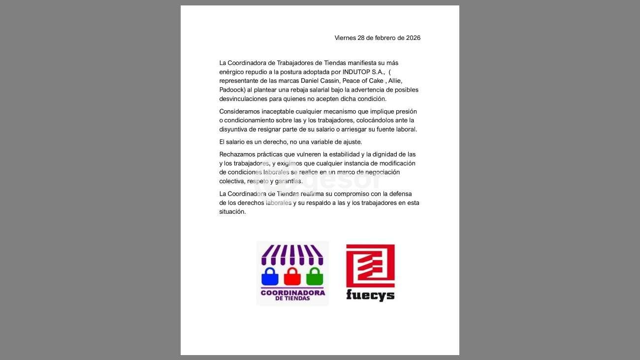 La Coordinadora de Trabajadores de Tiendas manifiesta su más enérgico repudio a la postura adoptada por INDUTOP S.A., (representante de las m...